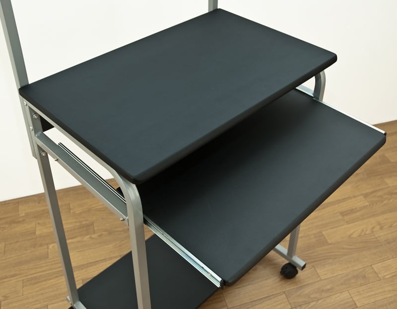 プリンターなどは上段の棚に、キーボードはスライドテーブルに、小物やソフトは下段の棚などに収納できます