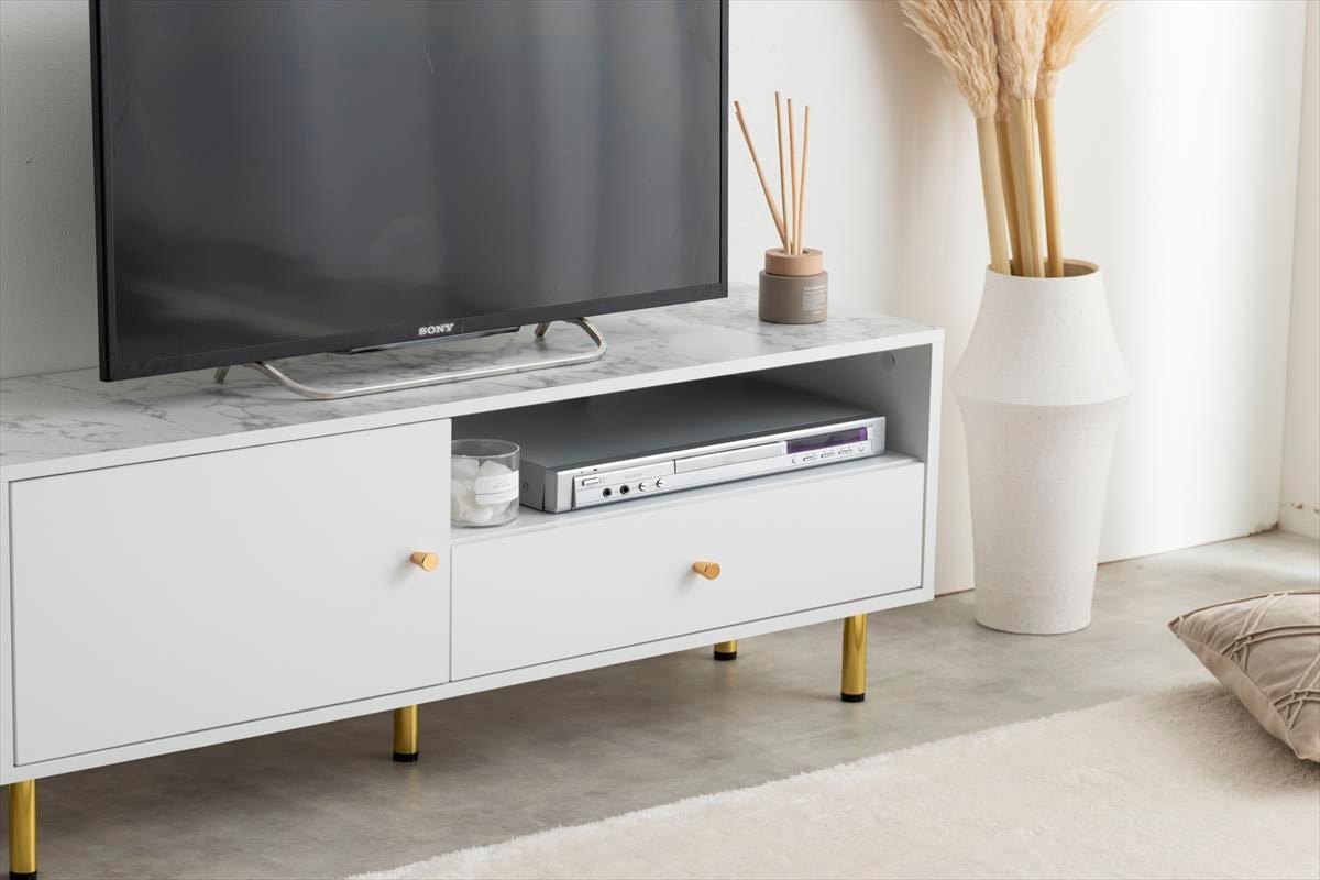 天板の大理石柄とゴールドのあしらいが特徴の『Camila(カミラ)』シリーズの引き出し付きテレビボード