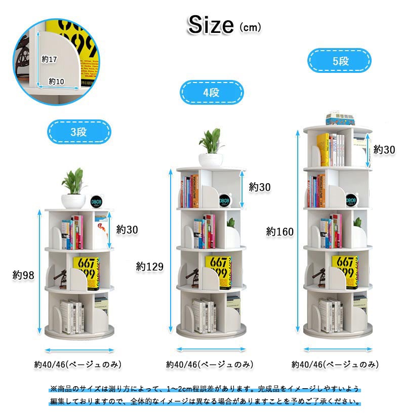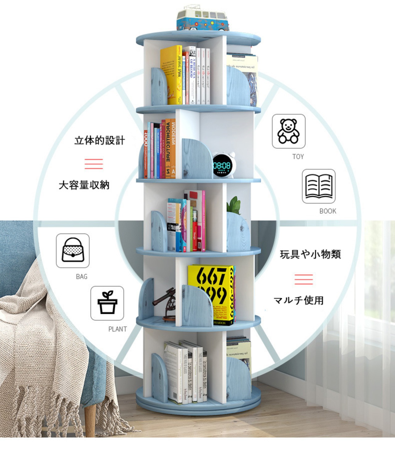回転式本棚 子供部屋 本収納 コミックラック お洒落ラック 360°回転 オーク ホワイト本棚 サイドテーブル4段