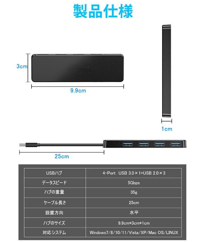 USB3.0ハブ 4ポート USB拡張 最大USB3.0 5Gbps 高速 小型 軽量 コンパクト 4in1 変換 アダプター